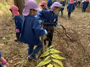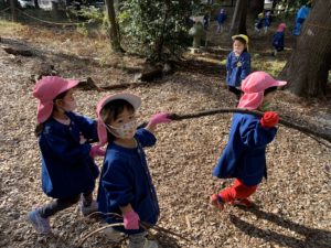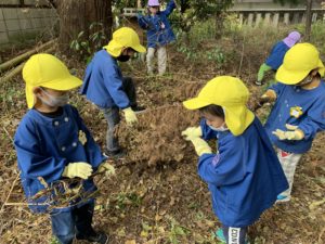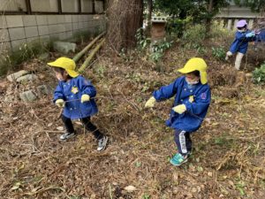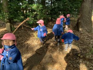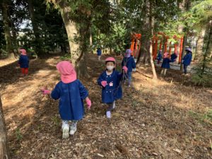 今日は焼き芋大会の為の枝を拾いにもも、ほし、ことり組で神社へ行きました✨