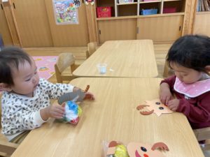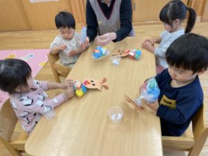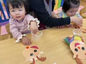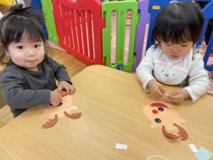 完成したトナカイさんを「見てー」と見せてくれたり、お友達が作ったトナカイさんを見たりと楽しく出来ました💕