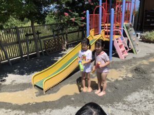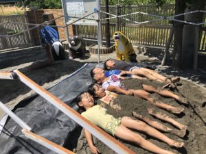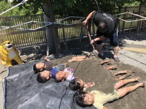 こども達が大好きな、水遊びの締めくくり、ことり組さんは「砂蒸し!」の号令で、砂場に寝そべります。園長すかさず、スコップで、砂をかけ・・・・ 大興奮のひと時です。
