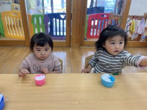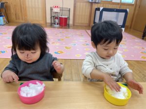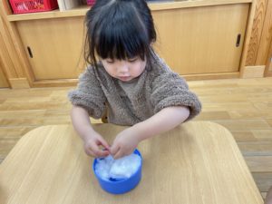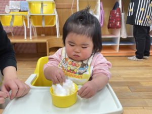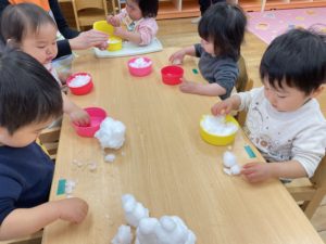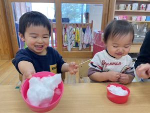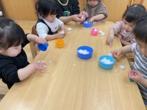 小さい雪だるまを作ったり、手で雪を握ったりとそれぞれ楽しんでいました!!