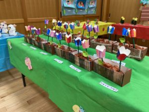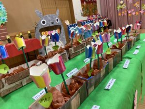 紙コップにスポンジで絵の具を塗り、チューリップを作りました🌷🌷好きな色を自由に組み合わせ、とてもカラフルな作品になりました😙