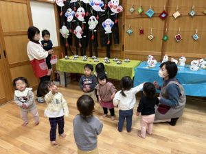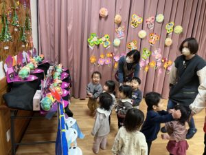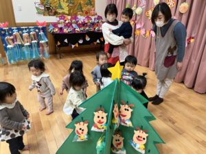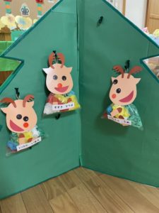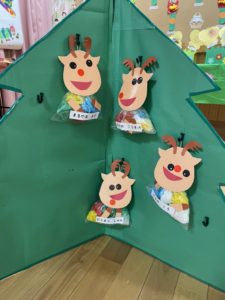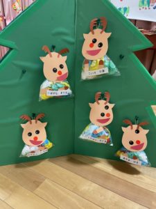 袋の中にお花紙を丸めて入れて、お顔はシールを貼って作りました。お花紙を選ぶときからみんなワクワクが止まりません♫「黄色!青!赤ー!」と欲しい色を言いながら選びました。出来上がった時はみんなでお互いに見せ合って拍手をして喜び合いました🎅