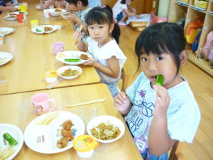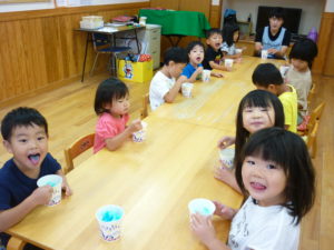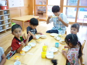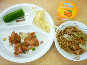今日は「お店屋さんごっこ」なので、給食も、頑張って「おまつり給食」をしました。今年は花火大会も様々な夏祭りも行われませんが、気分は屋台!子どもたちはとても喜んでくれました!(宮川)