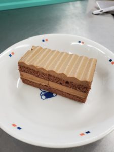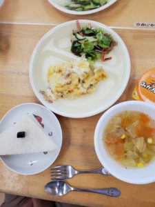 献立は『サンドイッチ・マカロニグラタン・カニカマサラダ・ベーコンスープ・みかんゼリー』おやつは『チョコレートケーキ(2歳児:イチゴケーキ0,1歳児:蒸しパン)』でした。