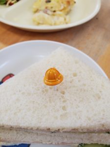 これが最後のお楽しみ給食になることり組さんからのリクエストによる献立でしたが、本当に喜んで食べてくれました!以上児さんのサンドイッチには、給食室からのピックのプレゼントがつきました!