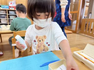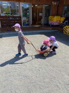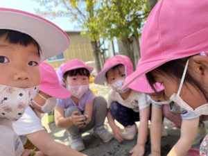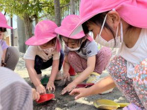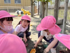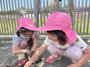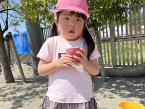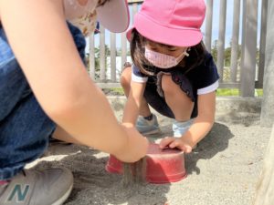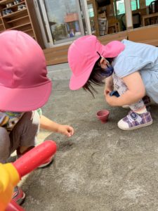 この日も泥団子作りを輪になってやってみたり、カップケーキ屋さんやジュース屋さんなどのごっこ遊びでも楽しんでいました🪣