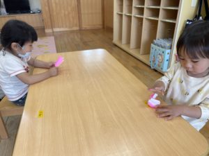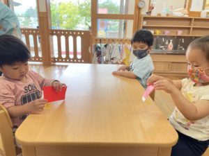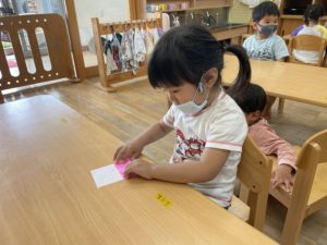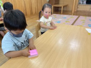 初めての折り紙製作でしたが、「はんぶんこ」や「アイロン(折り目をつける事です💡)」など折り方を知り、楽しく折ることが出来ました🍓