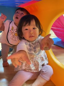 滑り台の下をくぐったり、穴の中から「おーい」と手を振ったりしていました!