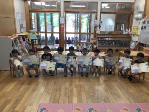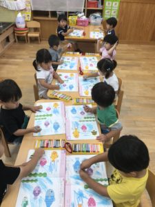 水色がわかり、クレヨンから水色を取り出して、ひとりひとり上手に海の出来上がり🐟🐟