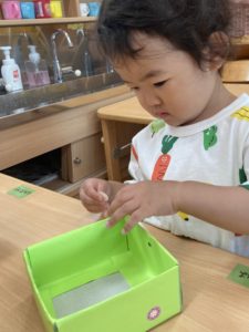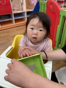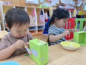 1歳児さんにとっては台紙からシールを剥がすのも大仕事💦みんな真剣な表情で取り組んでいました😳✨