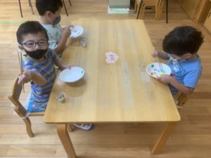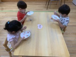 お皿のカラフルボールが全部コップの中に入ると…『美味しそうだね😁』『本当に飲みたくなっちゃった😋』とお友達との会話を楽しんでいました😌🎶