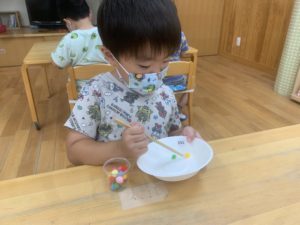 今日は雨が降っていたのでお部屋の中で箸のトレーニング🥢をしました!