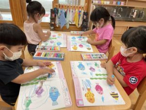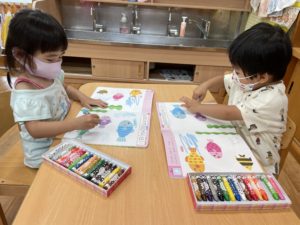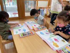 ワークでは様々なクレヨンの塗り方を練習していく為、保育士と一緒に塗り方の確認をしてから取り組みました😊