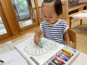 しっかり、イモムシの所にクレヨンで色をなれていました🐛!塗り終わると「見てみてー」と見せてくれました。