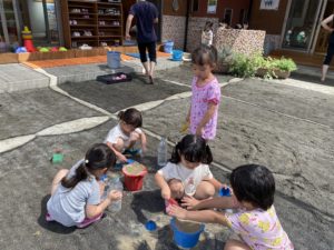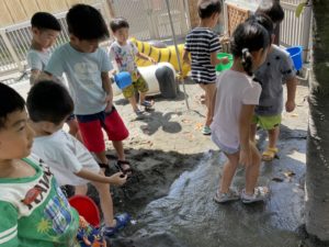 最後は、ほし組さんと一緒にいっせーので砂場に水を流しました!!🪣