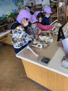 森の中へ行く前に色々な動物の骨に触れてみました!怖がらず興味津々なことり組さん!流石です⑅◡̈