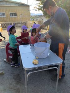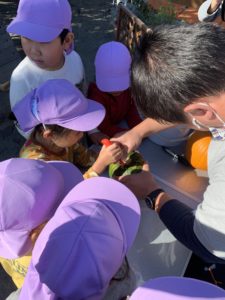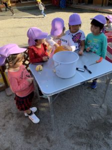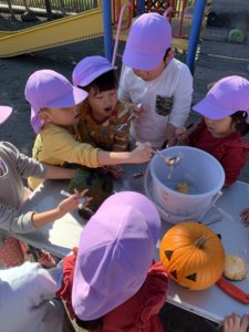 その後はノコギリを使い、実際にカボチャの目や鼻、口をくり抜きました!