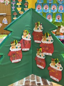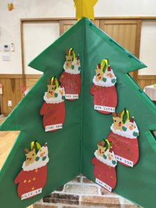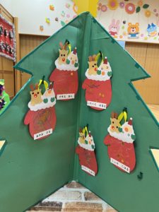 真っ赤な手袋をお絵描きと⭐️のシールで飾りつけ🧤サンタとトナカイのお顔は「どこがいいかな?」と相談しながら好きなところに貼ってもらいました🤭
