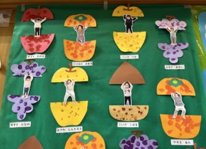 秋と言えば食欲の秋ですよね😋指スタンプやタンポで色づけをし、美味しそうな果物に仕上げました🍎飛び出しているように見える子ども達の姿もとても可愛いですね💓
