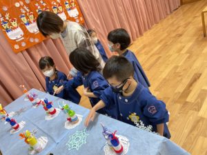 帽子はハサミを使ったり、雪だるまが寒くないようにカラフルな毛糸でマフラーを巻いてあげたり、服を貼り付けたりしました✨