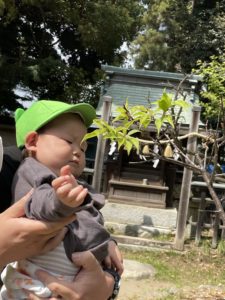 神社までは、お散歩カートに乗って行きましたが、着いてからはカートから降りて少し歩きました。