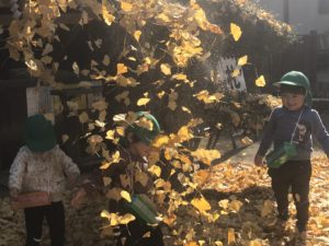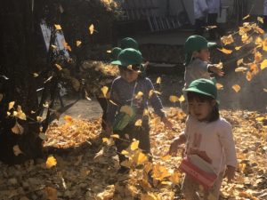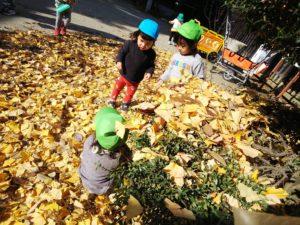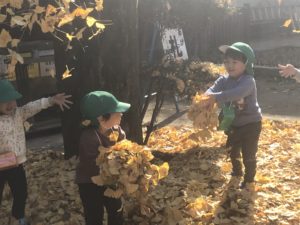いちょうの葉が全部落ち、いちょうのじゅうたんに子供たちは、大興奮!