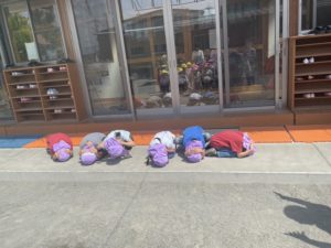 避難の方法やダンゴムシポーズの仕方、防災頭巾の被り方などを、紙芝居を使いながら話をしました。