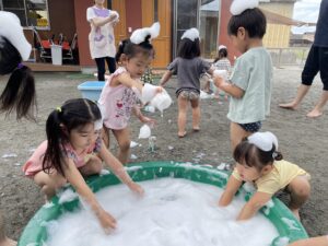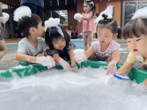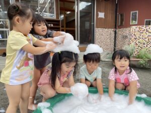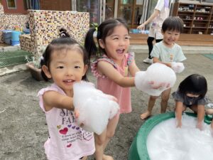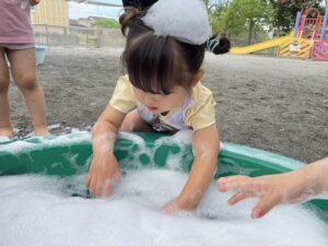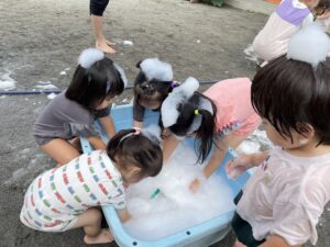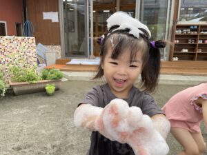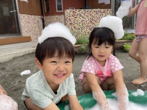 友達同士で泡を付け合ったり、体に泡を塗ったりと全身泡だらけになりながら楽しく泡遊びをすることが出来ました。💕