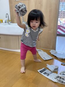 丸めた新聞紙は『ポーン』と上手に投げたり、大事そうに手に持っていたり…😌✨