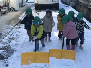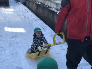 昨日降った雪がつもりみんな朝から大喜び☃️ みんなで早速外に出て雪遊びをしました⛄️ 裏の庭?の新雪みんなで、上に投げたり、雪かきのお手伝いも😆 とっても上手にできました😃 雪かきソリ🛷で1人一周の旅も♡ サラサラ雪だったので、小さい雪だるましか作れませんでしたが💦みんなで目や口をつけました⛄️ 残念ながら午後は溶けちゃいました😭 なかなかできない冬ならではの遊びを満喫できました! また雪遊びできるといいね😊 (小林)