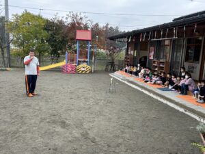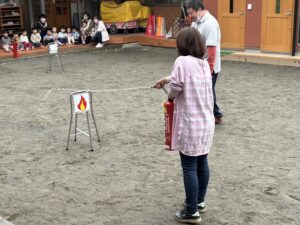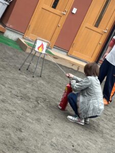 普段なかなか見ることの出来ない消火器の使い方を間近で見ることが出来、子ども達も興味深く見つめていました。