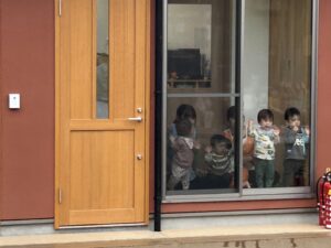 子ども達もテラスに出て、消火の様子を見学しました。