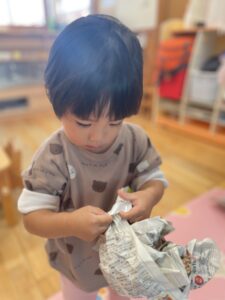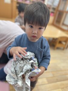 まずは新聞紙をくしゃくしゃ丸めて、ぎゅっぎゅっと握ります!