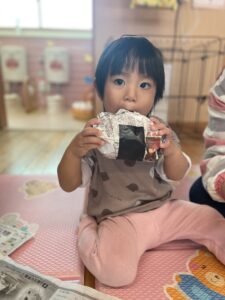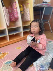 みんなでレジャーシート(これも新聞紙)に座ってモグモグ🤤💓
