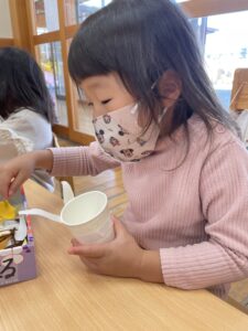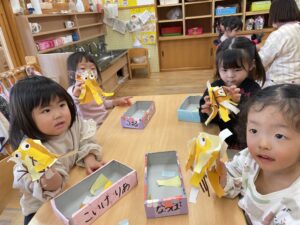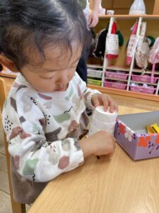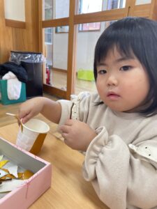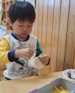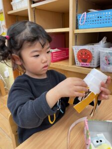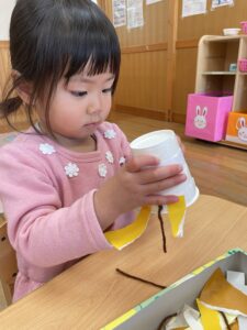 破いた折り紙や毛糸を紙コップに好きなように貼り付けました。毛糸🧶を髪の毛のようにする子や折り紙を色ごとに貼り付ける子など、それぞれ個性のあるミノムシが出来ました😊