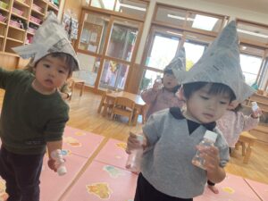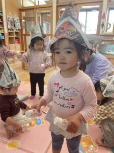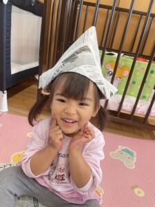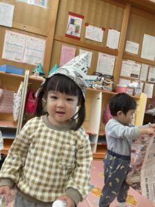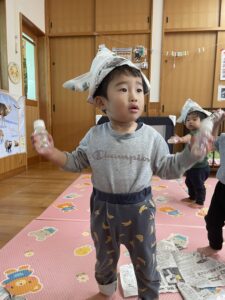 新聞紙の帽子をかぶって、プチ演奏会をしました🎵