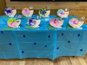 紙皿やモールを使って、かわいいカタツムリを製作しました。折り紙をちぎって文字盤にぺたぺた貼ると、すてきなアジサイになりました✨