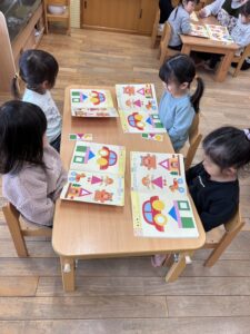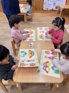 決められた色で絵を描いたり、枠の中にシールを貼ったりとさまざまなことを頑張りました🔥