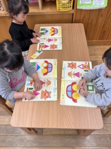 最後のページは、枠と同じ形のシールを綺麗に貼り付けるお勉強でした💪