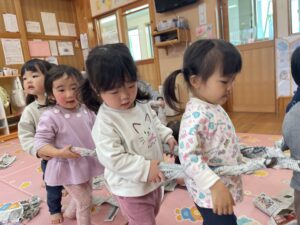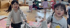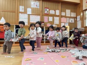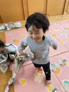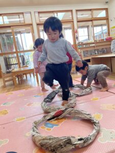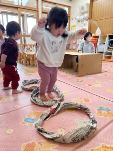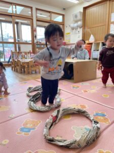 新聞紙で作ったフープをぴょんぴょん🐰!