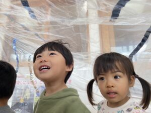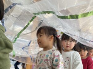 ダンボールを立てただけの簡易的なトンネルですが、これだけでも子どもたちはワクワク💓