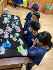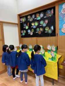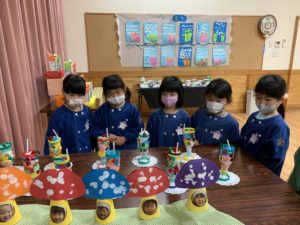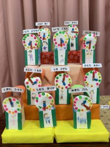 春の製作は自画像を描き、その周りには絵の具を使って流し絵をしました!時計の数字も上手に描き、屋根も自分たちで全部作りました✨