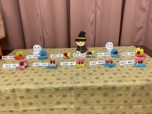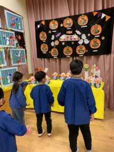 秋の製作では、どんぐりに顔を描き、紙粘土で 『はろうぃん』という文字と自分の名前を書きました(*ˆ﹀ˆ*)