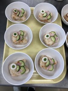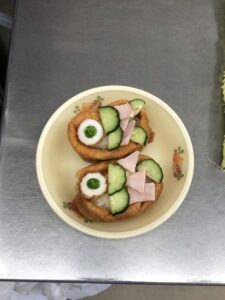 お昼の給食のいなり寿司を鯉のぼりにしました。そして出世魚でもあるサワラをマヨネーズ焼きにして食べました🐟