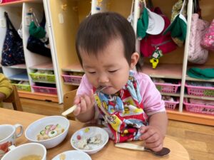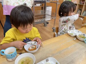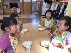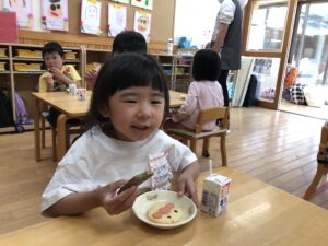 おやつはアンパンマンクッキー!以上児さんには兜の形のクッキー付きです。