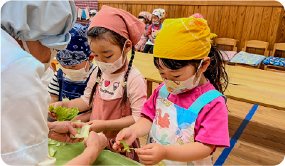 野菜作りやクッキングなどを通して食の楽しさ大切さや感謝の気持ちを育てると共に、箸の持ち方や「いただきます」「ごちそうさま」などの挨拶、食事の際の姿勢など食事のマナーも身につけます。 -