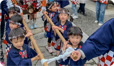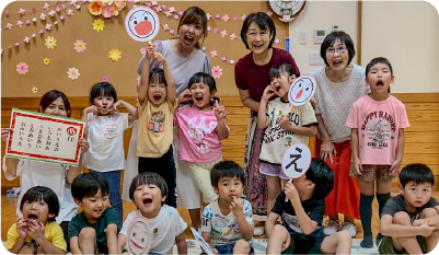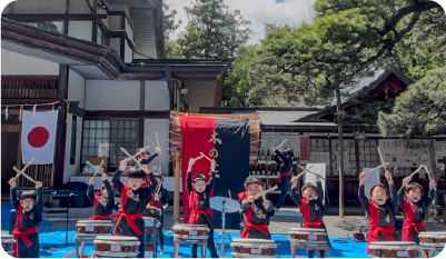 3歳児から全園児が和太鼓に取り組み、協力しやりとげる力と規律や礼儀を身につけます。市の太鼓連盟のフェスティバルを始め、町の文化祭や老人ホームに訪問しての演奏など、発表の機会も多くあります。